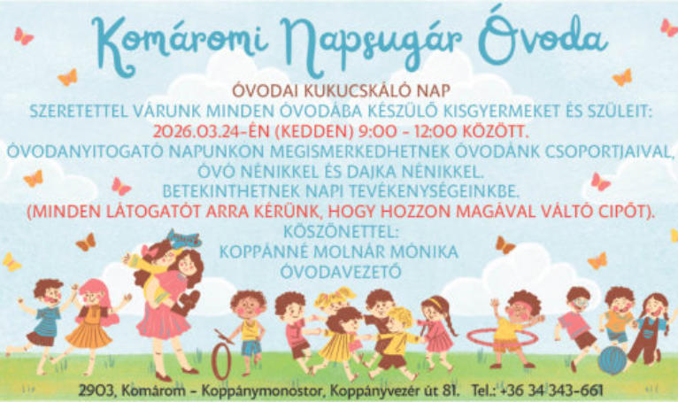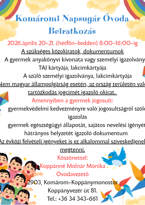ÓVODAI BEIRATÁS2026. április 20-21(Hétfőn-Kedden)8:00-16:00 óráigA gyermek óvodai beíratásához szükséges közokiratok, dokumentumok:A gyermek nevére kiállított személyazonosságot igazoló hatósági igazolványok:-eredeti születési anyakönyvi kivonat vagy személyazonosító igazolvány,-lakcímet igazoló hatósági igazolvány (lakcímkártya)-hatósági bizonyítvány (TAJ kártya)A szülő személyazonosságát igazoló hatósági igazolványok:-érvényes személyazonosító igazolvány vagy magyar útlevél vagy 2001 július 1. utáni kiadott kártya formátumú vezetői engedély-lakcímet igazoló hatósági igazolvány (lakcímkártya)Egyéb dokumentumok:-a gyermekvédelmi kedvezményre való jogosultságról szóló igazolás, (a gyermek egészségi állapotát, sajátos nevelési igényét, hátrányos helyzetét igazoló dokumentum)-nem magyar állampolgárság esetén, az ország területén való tartózkodás jogcímét igazoló okiratAz óvoda vezetője az óvodai felvételi kérelemnek helyt adó döntését írásban, a kérelem elutasítására vonatkozó döntését írásban, határozati formában közli a szülővel. Az óvodai felvétel tárgyában meghozott döntés közlésének határnapja: 2026.05.21.Az óvodavezető első fokon hozott, elutasító határozata ellen jogorvoslati kérelmet Komárom város jegyzőjének címezve, az intézményvezetőnek kell benyújtani.A szabálysértésekről, a szabálysértési eljárásól és a szabálysértési nyilvántartási rendszerről szóló 2012. évi II. törvény 247. §-a értelmében, az a szülő vagy törvényes képviselő, - aki a szülői felügyelete vagy gyámsága alatt álló gyermeket kellő időben az óvodába nem íratja be, szabálysértést követ el, ellene szabálysértési eljárás kezdeményezhető.Komárom Város Önkormányzata fenntartásában működő óvodák, alapító okiratuk szerint fogadják a város közigazgatási határán belül élő, integráltan nevelhető sajátos nevelési igényű gyermekeket. A sajátos nevelési igényű gyermekek – akik a szakértői bizottság véleménye alapján mozgásszervi, érzékszervi, értelmi vagy beszédfogyatékos, több fogyatékosság együttes előfordulása esetén halmozottan fogyatékos, autizmus spektrum zavarral vagy egyéb pszichés fejlődési zavarral (súlyos tanulási, figyelem-vagy magatartásszabályozási zavarral) küzdenek – érvényes szakértői vélemény alapján vehetők fel az intézménybe.Komárom, 2026. Komárom Város ÖnkormányzataKukucskáló napokKözleményKomárom Város Önkormányzata által fenntartott óvodákba való jelentkezés idejéről, módjáról, az óvodakötelezettség teljesítéséről a 2026/2027. nevelési évre vonatkozóanAz óvodai felvétel jelentkezés alapján történik. Az óvodai jogviszony a beíratás napján jön létre.Az óvoda a gyermek hároméves korától a tankötelezettség kezdetéig nevelő intézmény. Az óvoda felveheti azt a gyermeket is, aki a harmadik életévét a felvételétől számított fél éven belül betölti, feltéve, hogy minden, a településen lakóhellyel, ennek hiányában tartózkodási hellyel rendelkező hároméves és annál idősebb gyermek óvodai felvételi kérelme teljesíthető.A gyermek abban az évben, amelynek augusztus 31. napjáig a harmadik életévét betölti, a nevelési év kezdő napjától legalább napi négy órában óvodai foglalkozáson vesz részt. A szülő - tárgyév április 15. napjáig benyújtott - kérelme alapján a gyermek jogos érdekét szem előtt tartva, annak az évnek az augusztus 31. napjáig, amelyben a gyermek a negyedik életévét betölti, különös méltánylást érdemlő esetben, újabb kérelem alapján annak az évnek az augusztus 31. napjáig, amelyben a gyermek az ötödik életévét betölti a Kormány rendeletében kijelölt szerv, azaz a járási hivatal felmentheti az óvodai foglalkozáson való részvétel alól, ha a gyermek családi körülményei, sajátos helyzete indokolja.Ha a gyermek az óvodakötelezettségét külföldön teljesíti, akkor a szülő köteles arról a beiratkozás idejének utolsó határnapját követő tizenöt napon belül írásban értesíteni az Oktatási Hivatalt. (A bejelentést a www.oktatas.hu oldal Köznevelés menüpontjának Külföldre távozás bejelentése pontjából, vagy https://www.oktatas.hu/kozneveles/kulfoldre_tavozas_bejelentese linken elérhető elektronikus űrlap kitöltésével és postai úton történő beküldésével tudják teljesíteni.)A napi négy órában óvodai nevelésre kötelezett, az óvodával jogviszonyban álló gyermek szülője, ha gyermeke az óvodakötelezettségét a jövőben külföldön teljesíti, előzetesen köteles értesíteni az óvodavezetőt.A szülő, gyermeke óvodai felvételét bármikor kérheti, a gyermekek felvétele folyamatos.A nemzeti köznevelésről szóló 2011. évi CXC. törvény 49. § (3) bekezdése az óvoda köteles felvenni, átvenni azt a gyermeket, aki életvitelszerűen az óvoda körzetében lakik.A nemzeti köznevelésről szóló 2011. évi CXC. törvény 49. § (2) bekezdése 2021. május 19. napjától hatályát vesztette. A módosítás értelmében az óvoda már nem köteles azt a gyermeket felvenni, akinek szülője az óvoda körzetében dolgozik.